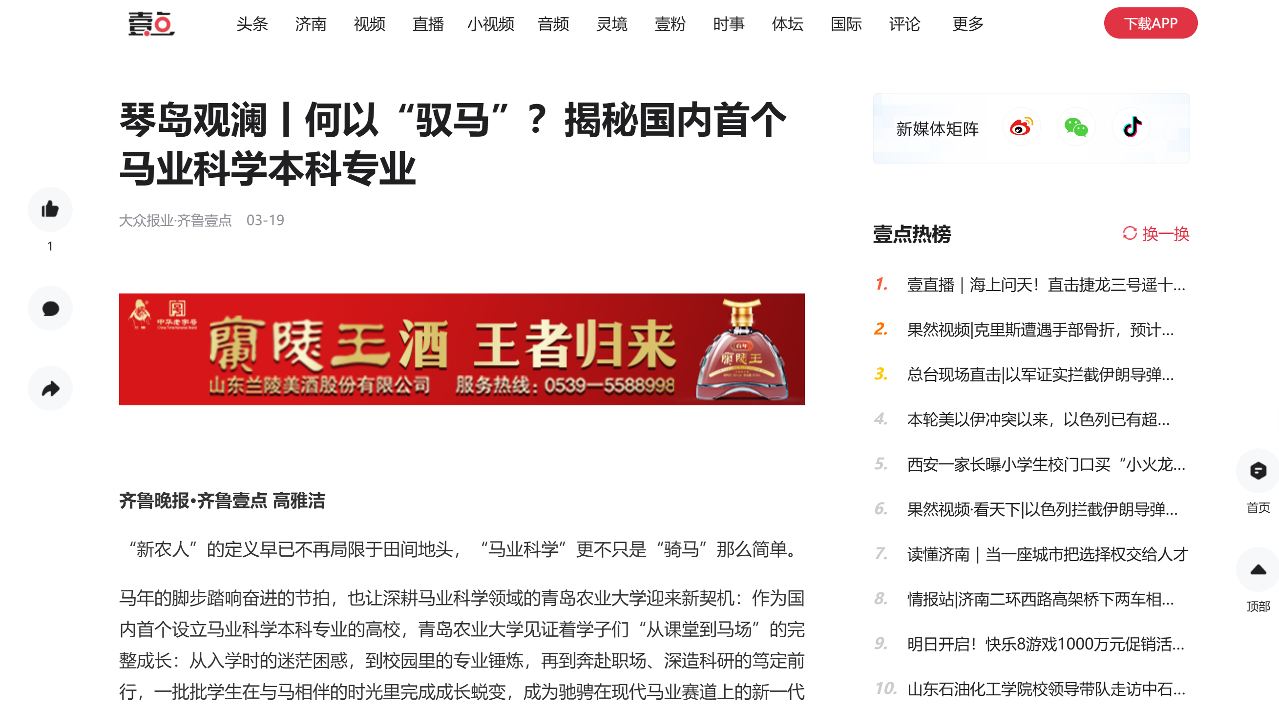 【编者按】3月19日,大众报业·齐鲁壹点、齐鲁晚报青岛融媒报道了青岛农业大学马业科学学院学生在与马相伴的时光里完成成长蜕变,成为驰骋在现代马业赛道上的新一代“新农人”。