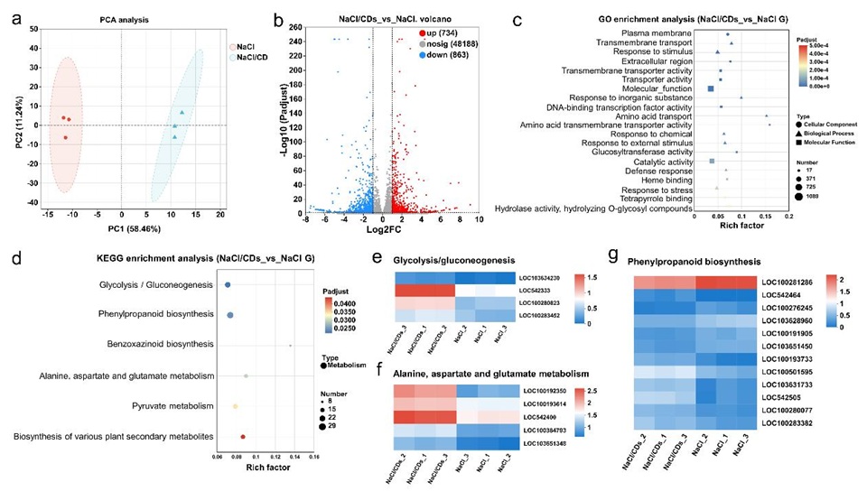 为深入揭示其作用本质,团队进一步进行了转录组学分析。研究发现,碳点纳米酶并非“头痛医头、脚痛医脚”,而是能够系统性调控玉米幼苗体内多条关键代谢通路,从而帮助作物建立起一个多层次、立体的耐盐防御网络,实现从“被动抵抗”到“主动适应”的转变。