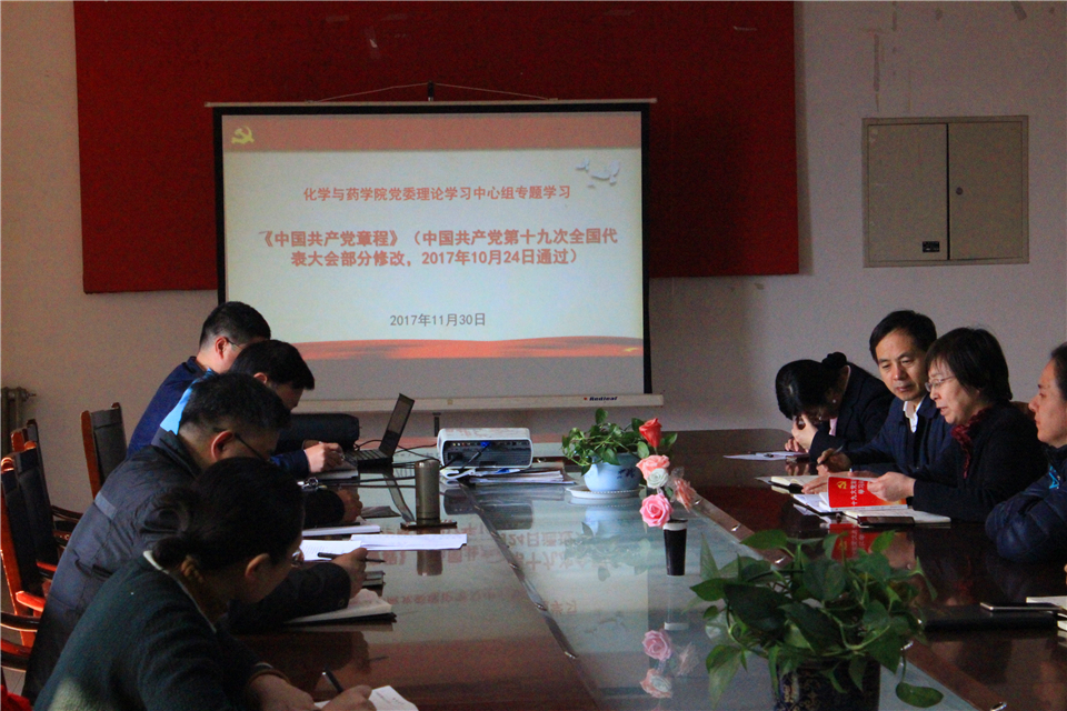 11月30日,青岛农业大学化学与药学院党委理论学习中心组于学院会议室召开会议,组织集中学习《中国共产党章程(修正案)》。会议由学院党委书记梁安波主持,党委委员、各党支部书记参加。